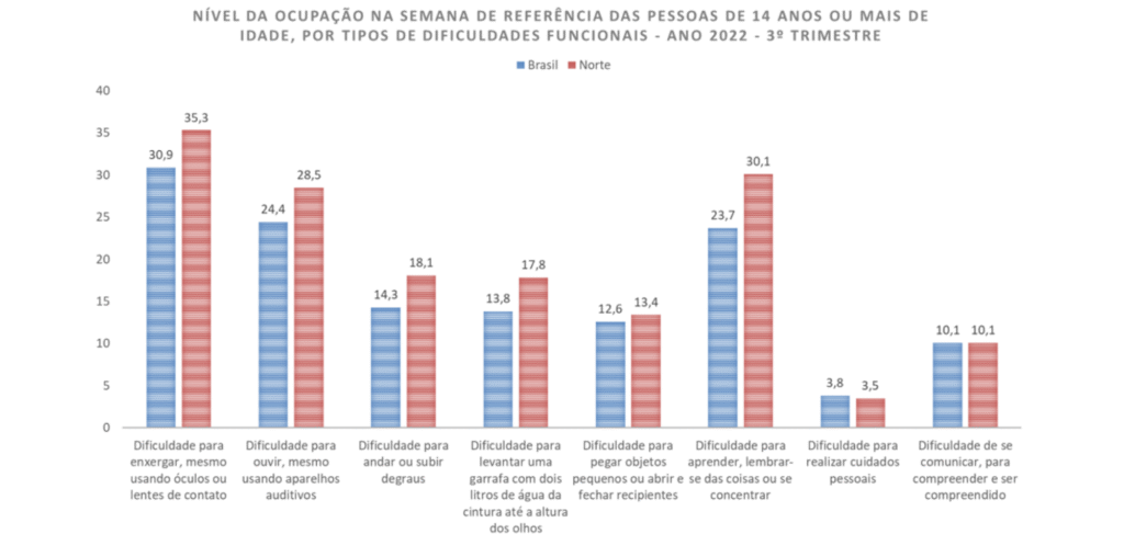 Esse destaque não é isolado. Dos cinco estados com maiores índices de empregabilidade de PcDs, quatro estão localizados na Região Norte, revelando uma tendência regional de maior inclusão no mercado de trabalho. Entre os tipos de deficiência mais declarados na região, predominam a dificuldade para enxergar (35,3%) e a dificuldade de aprendizagem (30,1%).