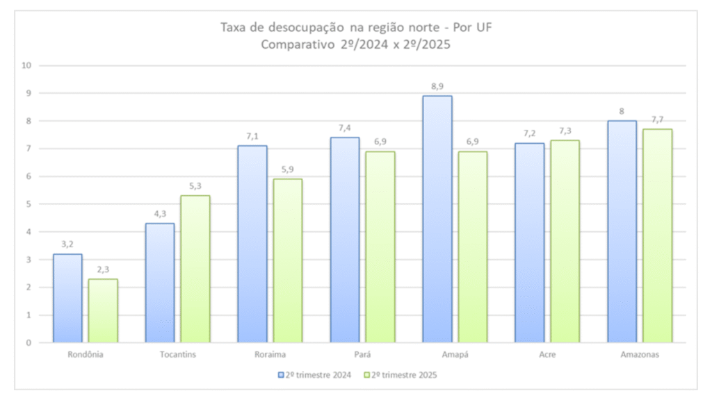 Entre os destaques positivos, Rondônia registrou apenas 2,3% de desocupação, consolidando-se como o segundo estado com menor desemprego do país, atrás apenas de Santa Catarina.